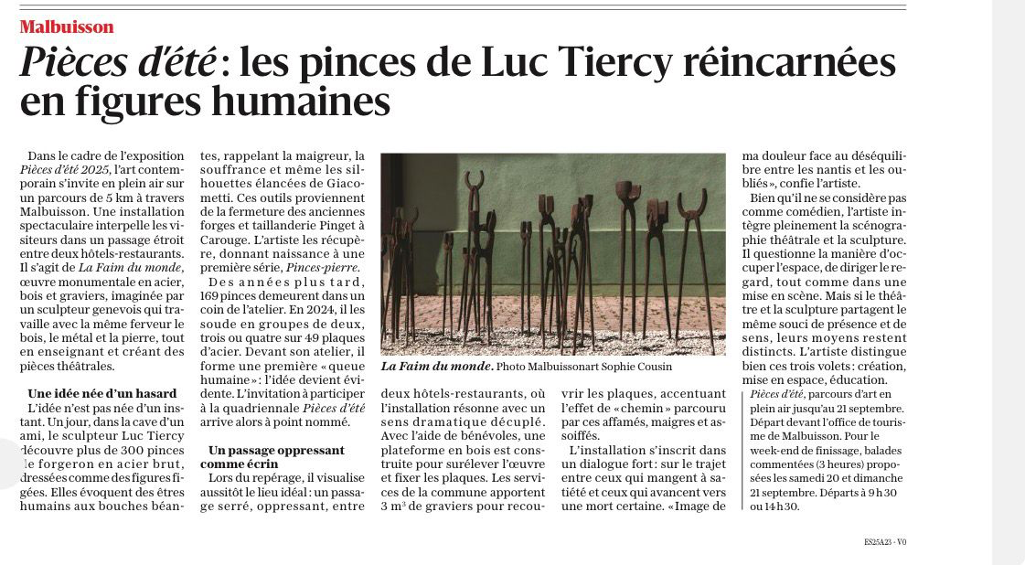 Est Républicain: Pièces d’été : les pinces de Luc Tiercy réincarnées en figures humaines (sept. 2025)